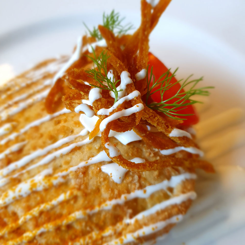 Fagottini di frolla salata con ripieno di guanciale e zucca su crema di formaggio
