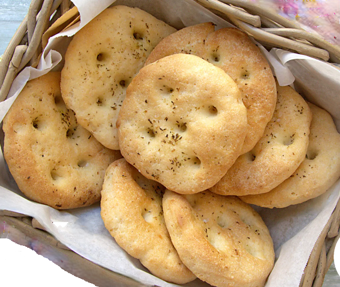 Elegante vassoio con un assortimento di Focaccine bianche, lisce, senza farcitura